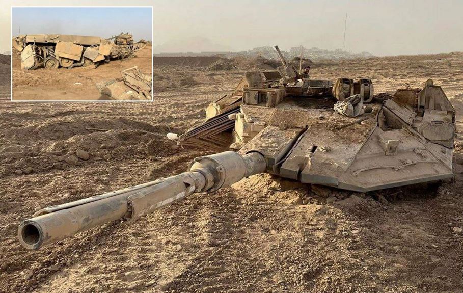 أول دبابة إسرائيلية طراز Merkava Mk 4 Barak مدمرة بواسطة عبوة ناسفة في قطاع غزة